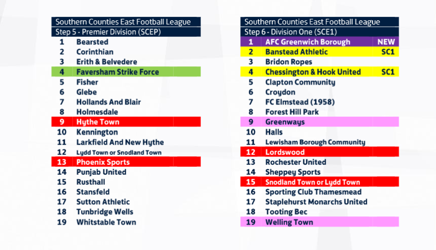 Laterally joining us at Step 6 are Banstead Athletic and the returning Chessington & Hook Utd while AFC Greenwich Borough are the new entrants to the National League System.